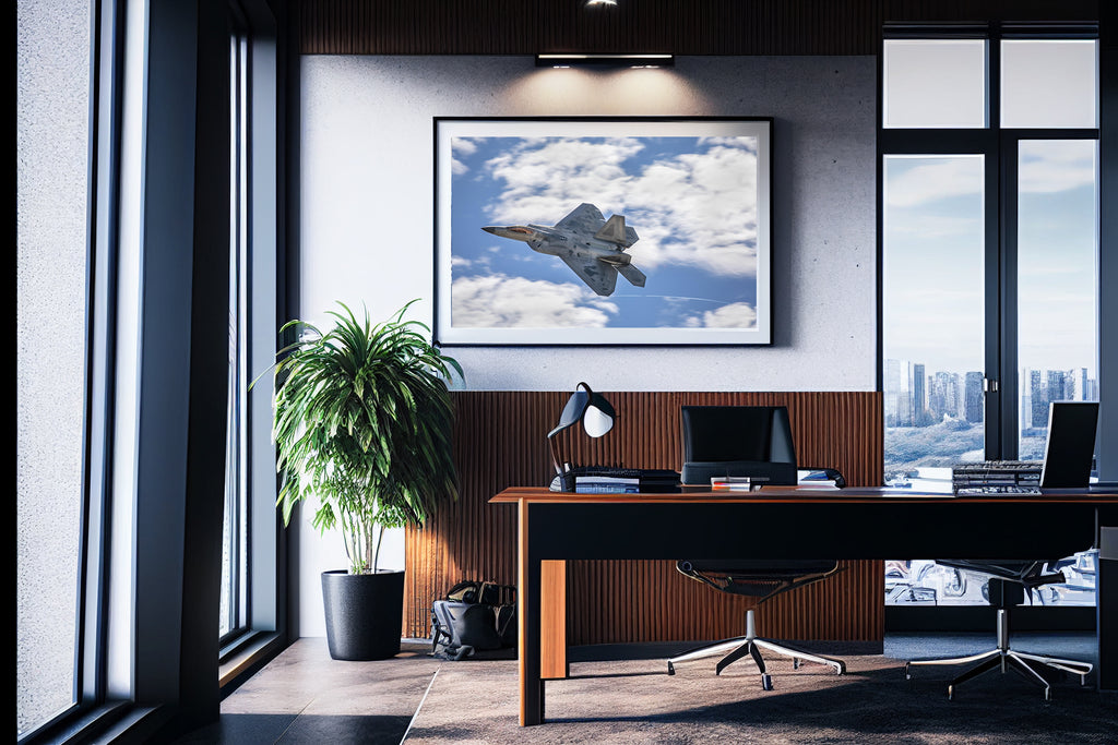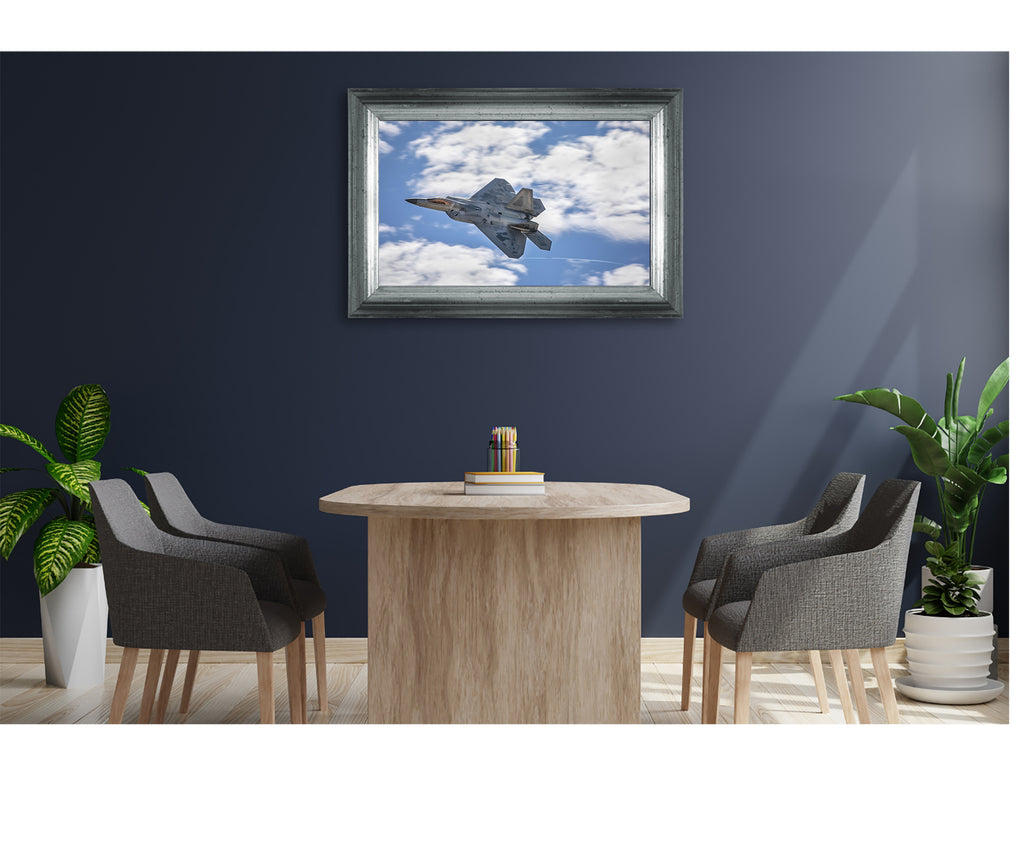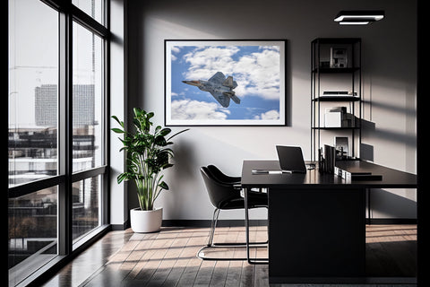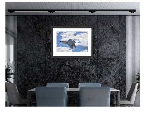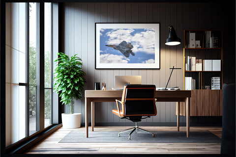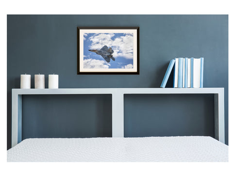 Existing photography of an F-22 Raptor in a high speed maneuver. This photograph is printed on high gloss archival paper of the highest quality. It's available in three sizes, print only.